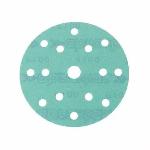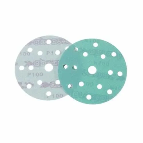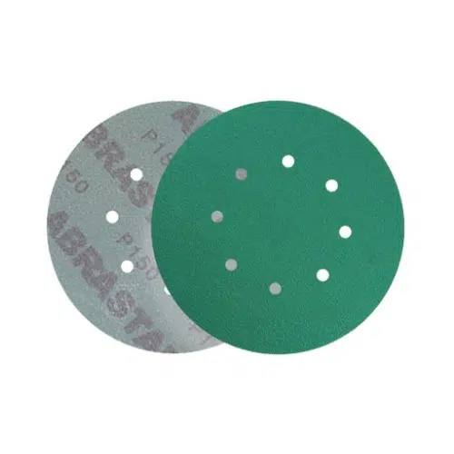Disco abrasivo film con velcro ABRASTAR STAR GREEN. Disco para lijado versátil y polivalente de alto rendimiento, ideal tanto para trabajos de desbaste como para procesos finales. Disponible en diferentes diámetros, con y sin aspiraciones.
