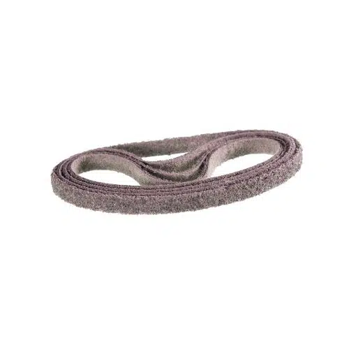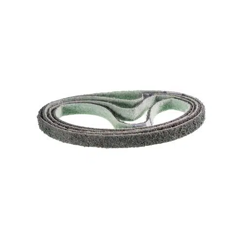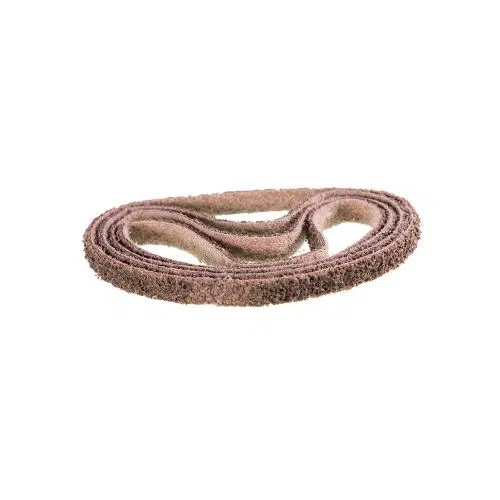 Lija de banda portátil para lima mini A MEDIDA con soporte y material de fibra no tejida ABRASTAR SCM. Abrasivo fabricado con tipo de junta tope y especialmente indicado para procesos y tratamientos de superficies en metal. Producto industrial para procesos de desbarbado ligero, limpieza, acabado y matizado.