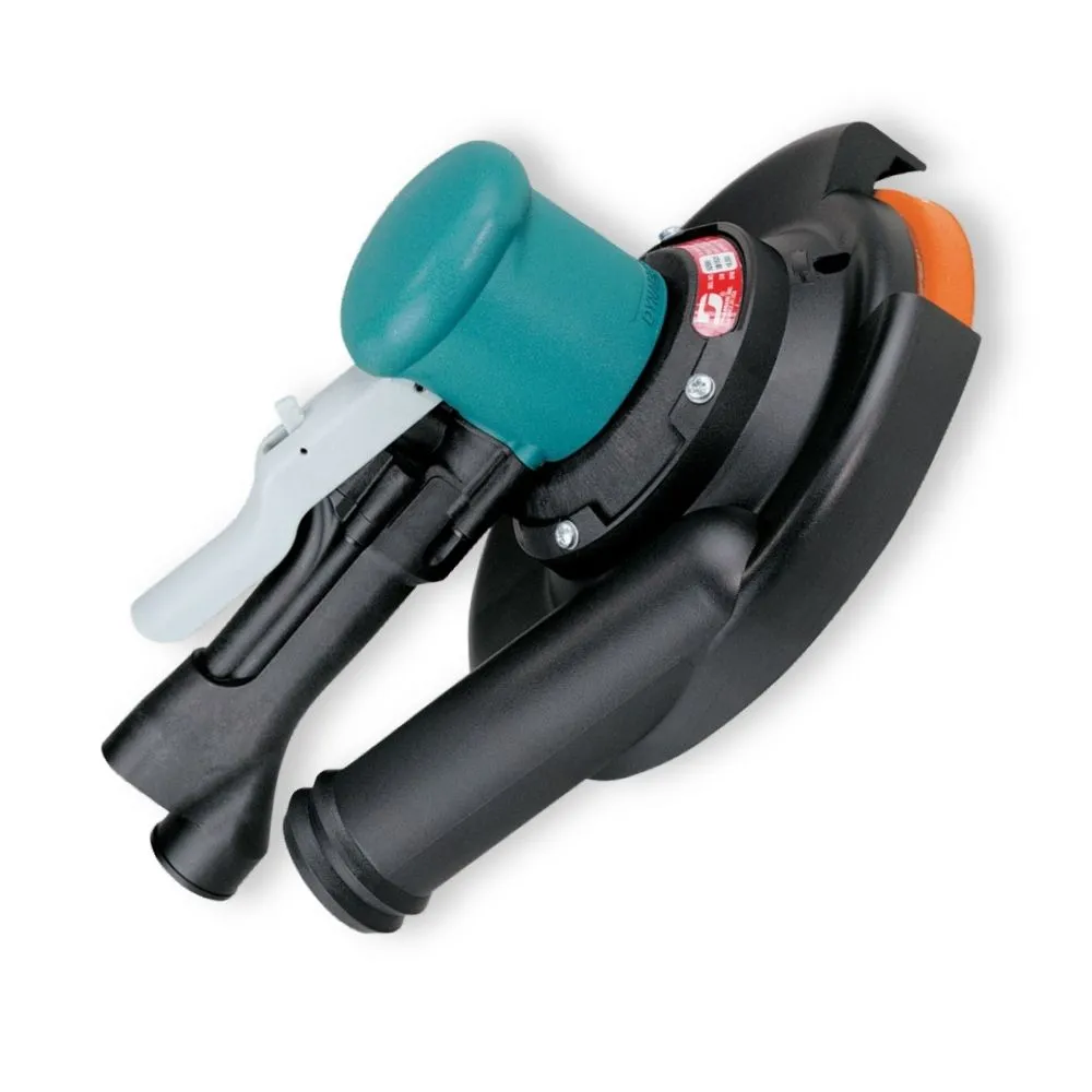 Lijadora a dos manos DYNABRADE 58446 con aspiración central y 203 mm. de diámetro. Los modelos de aspiración centralizada se conectan a sistemas externos y cuentan con faldón con junta labial para mayor visibilidad y extracción. Su diseño antiobstrucción mejora el lijado en rellenos húmedos.