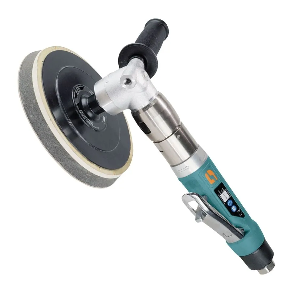 Pulidora de dos manos ángulo recto DYNABRADE 51396. Esta herramienta de 6″-8″ y 1 hp alcanza 2.800 RPM con motor neumático de alta calidad y engranajes planetaios de fácil lubricación. Compatible con accesorios de 6″ a 8″, cuenta con rosca macho 5/8″-11, acelerador con bloque de seguridad y empuñadura de agarre suave ajustable para uso ambidiestro